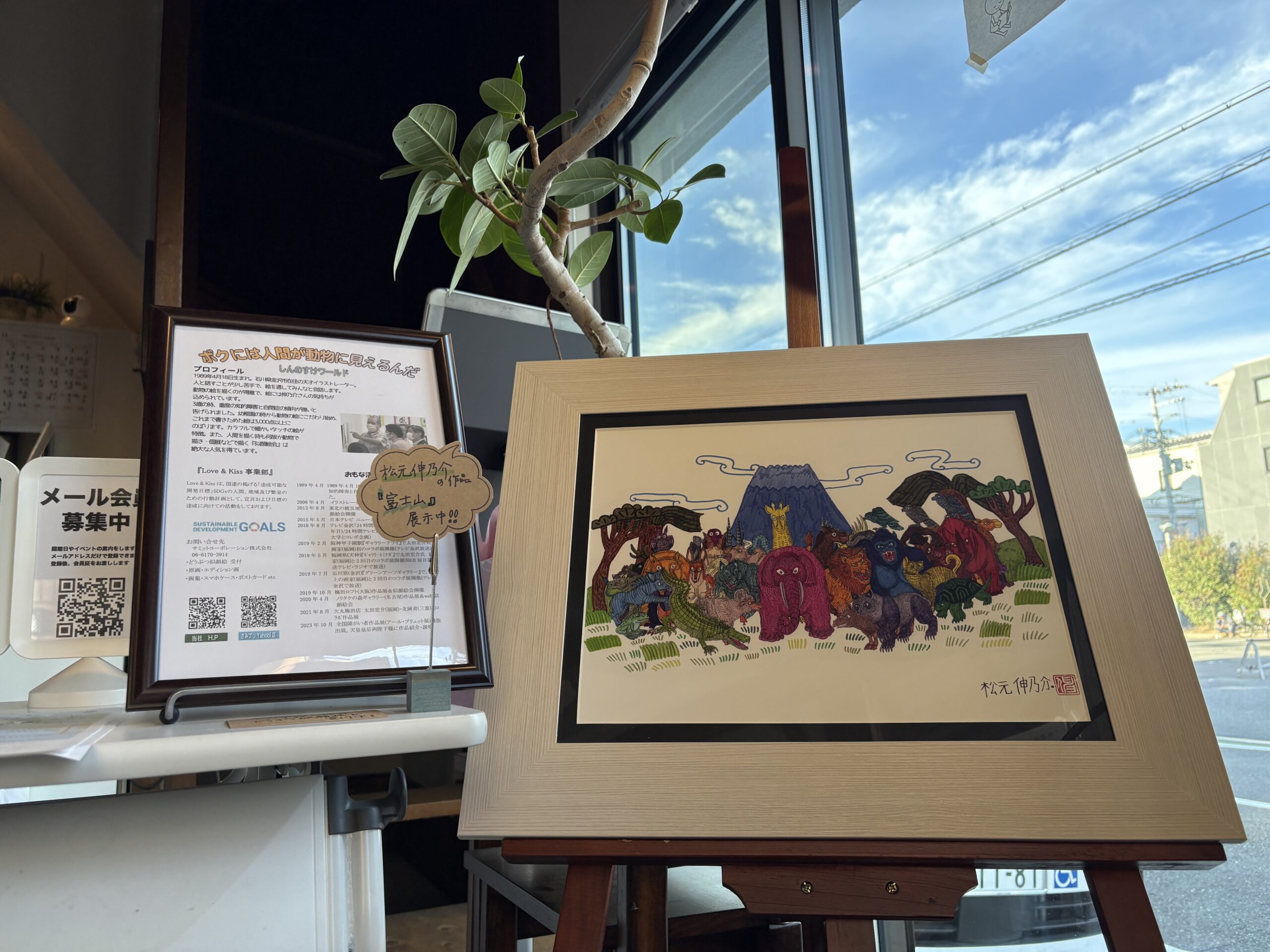 伸乃介さんは3歳の時に重度の知的障害と診断されますが、イラストレーターとしての才能を開花し、石川県を中心に全国各地で活躍され、メディアでもたびたび紹介されています。独特の着想で、人が動物に見えるという、動物似顔絵が人気を博しています。