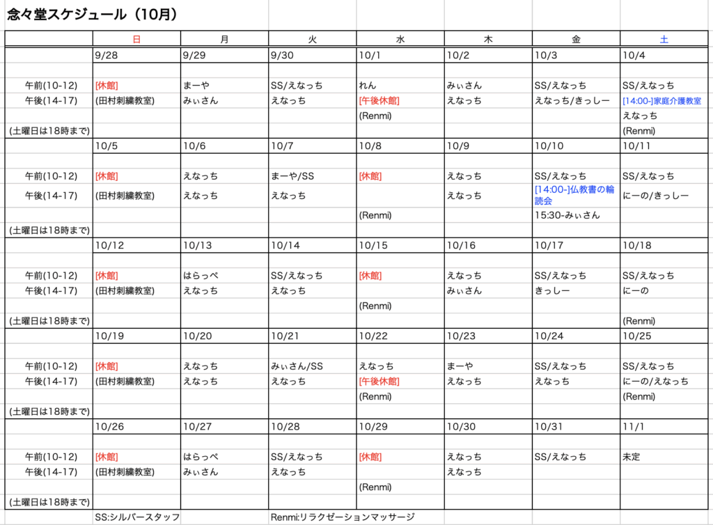 *ボランティアで運営しておりますので、店番の都合などにより休館になる場合があります。予めご了承ください。急な休館は、できるだけ念々堂前の掲示板やLINE、メールなどでご連絡いたします。